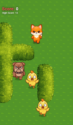 Navigate through a maze of bushes, hunting down chicks before the dog catches you. Each level gets progressively harder as the dog becomes faster and more relentless.